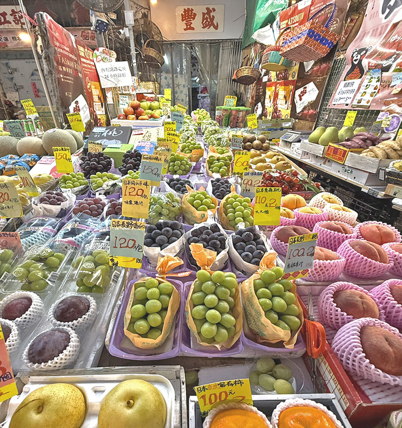 香港中心部にある青果市場、油麻地フルーツマーケットを視察しました。商品は1パックから販売され、買い物に来る一般の人々もいました。日本産の様々なフルーツがところ狭しと陳列されていることが印象的です。いかに日本の果物が香港で受け入れられているかが伺えました。