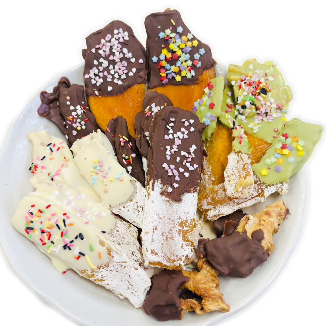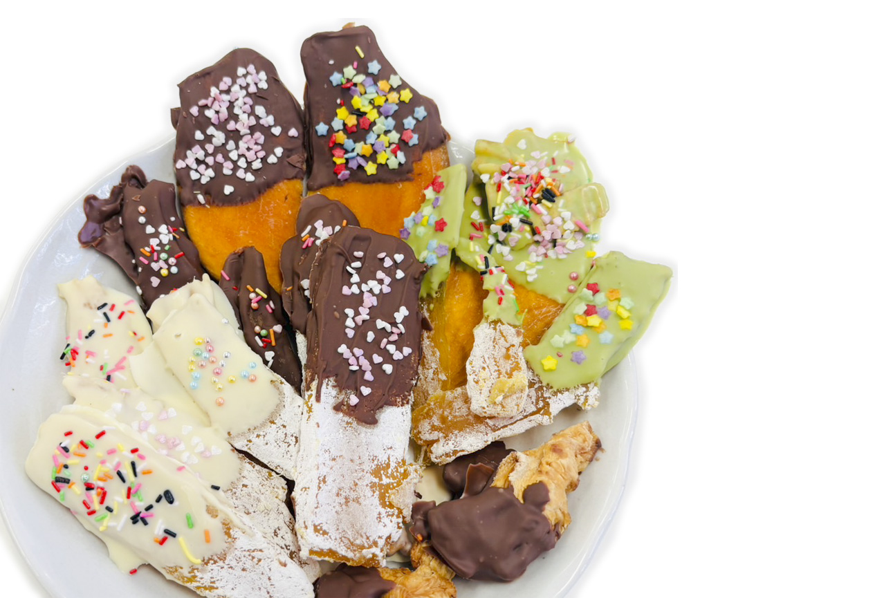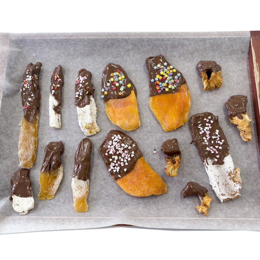 干し芋・ドライマンゴー・ドライパインに(1)を半分掛け、クッキングシートの上に並べます。この時にお好みでトッピングしてください。