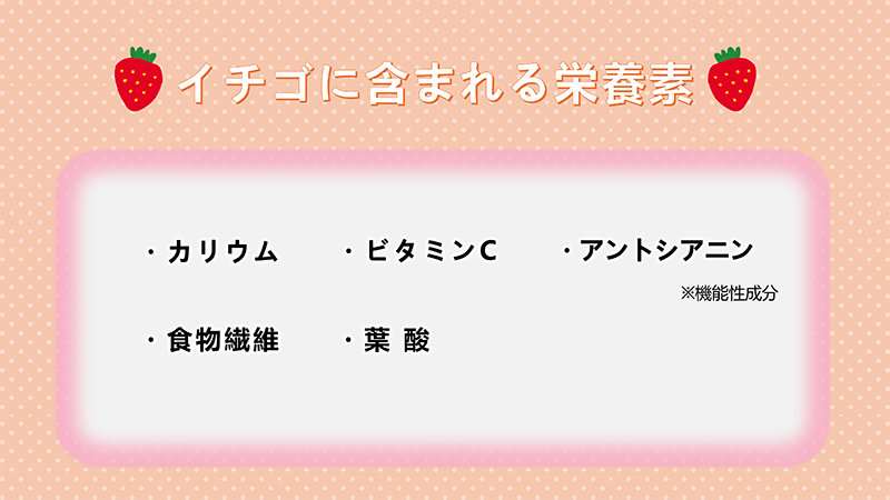 - さらに、イチゴの赤色成分であるアントシアニンは高い抗酸化作用があり、生活習慣病の予防にも効果的であるとされています。